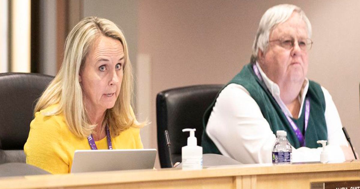 Former Board Clerk Alicia Smith, left, speaks beside then-Chairman Tim Bolin during a Laramie County School District 1 Board of Trustees meeting June 5 at Storey Gym in Cheyenne. Alyte Katilius/Wyoming Tribune Eagle